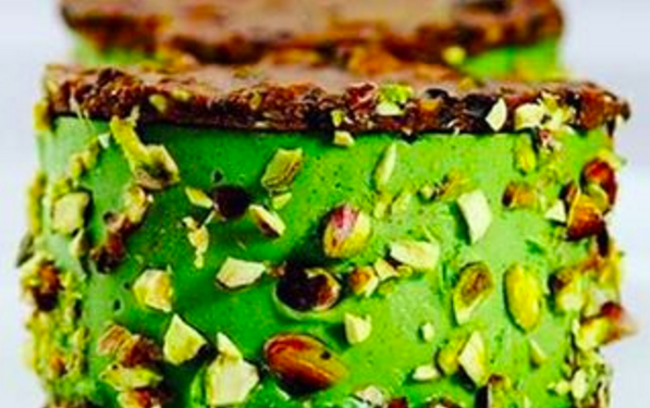 Remove ice cream sandwiches from freezer and allow to thaw just slightly. Press chopped pistachios into the sides of the sandwiches.
