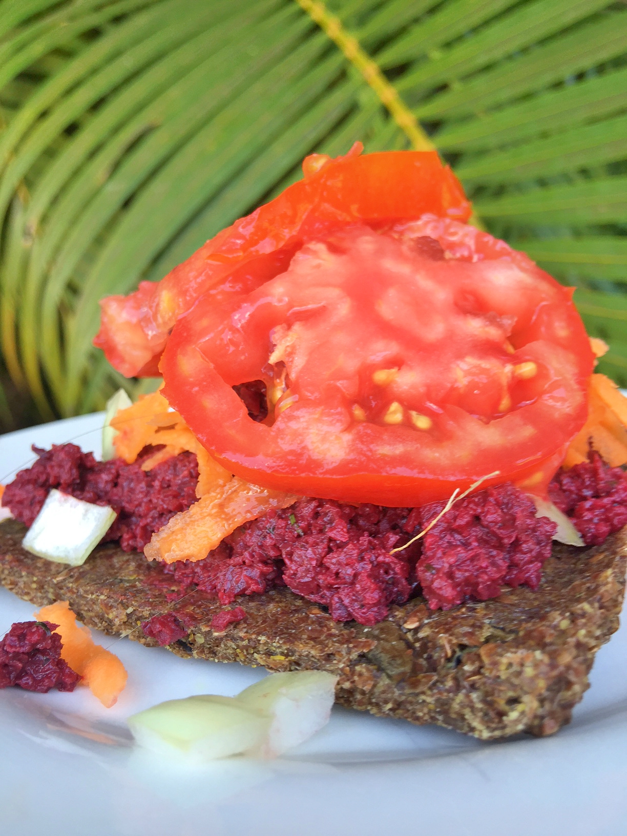 We’ve been craving some delicious raw breads after a few days eating raw vegetables and fruits, and this Raw Vegan Basil Bread hit the spot. The psyllium gives it a spongy texture that we were able to use it as sandwich bread, toast, and as a pizza base.