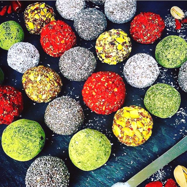 Technicolor Cacao Super Bliss Bites! Dates, cacao, coconut oil, plus a variety of nuts, seeds, and superfoods like goji, maca, moringa, golden berries, chaga, purple corn, macuna, suma, coconut flakes, and matcha green tea.